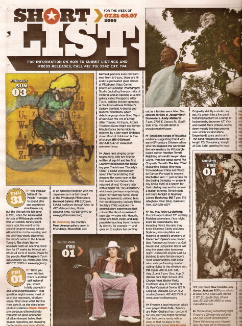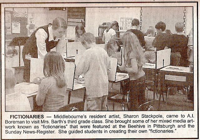 “Lots of coffeehouses are art galleries du jour — and it’s certain that more people at least glimpse the stuff on cafe walls than do so in your average gallery. The South Side’s Beehive has long exemplified the practice, and tonight’s reception for a former newspaper columnist from Middlebourne, W. Va., shows why. Fictionaries is Sharon Stackpole’s collection of mixed-media paintings, words and images, glowing with color and tinged with mystery. “My art is not about creating the world in which you live,” says Stackpole. “It’s meant to create the world I can’t live without.” –Bill O’Driscoll, Pittsburgh City Paper