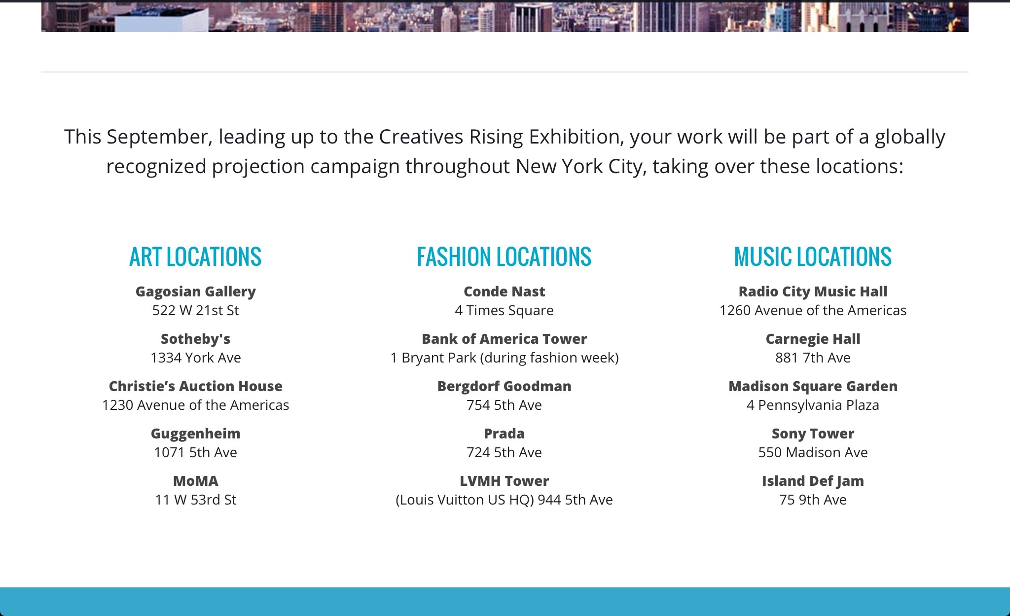 “Creatives Rising“, See.Me, viewing of work on skyscraper in NYC among other prime locations in September 2013.