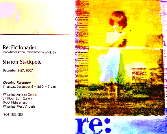 Sharon Lyn Stackpole studied art at Fairmont State and West Virginia University, but has also read poetry in coffeehouses in San Francisco, and worked as an award-winning reporter for the Wheeling Intelligencer and News-Register. Recently her series, Fictionaries, traveled around the state of West Virginia and also exhibited at the Beehive in Pittsburgh, Pennsylvania. Fictionaries was all about the blending of word and image.